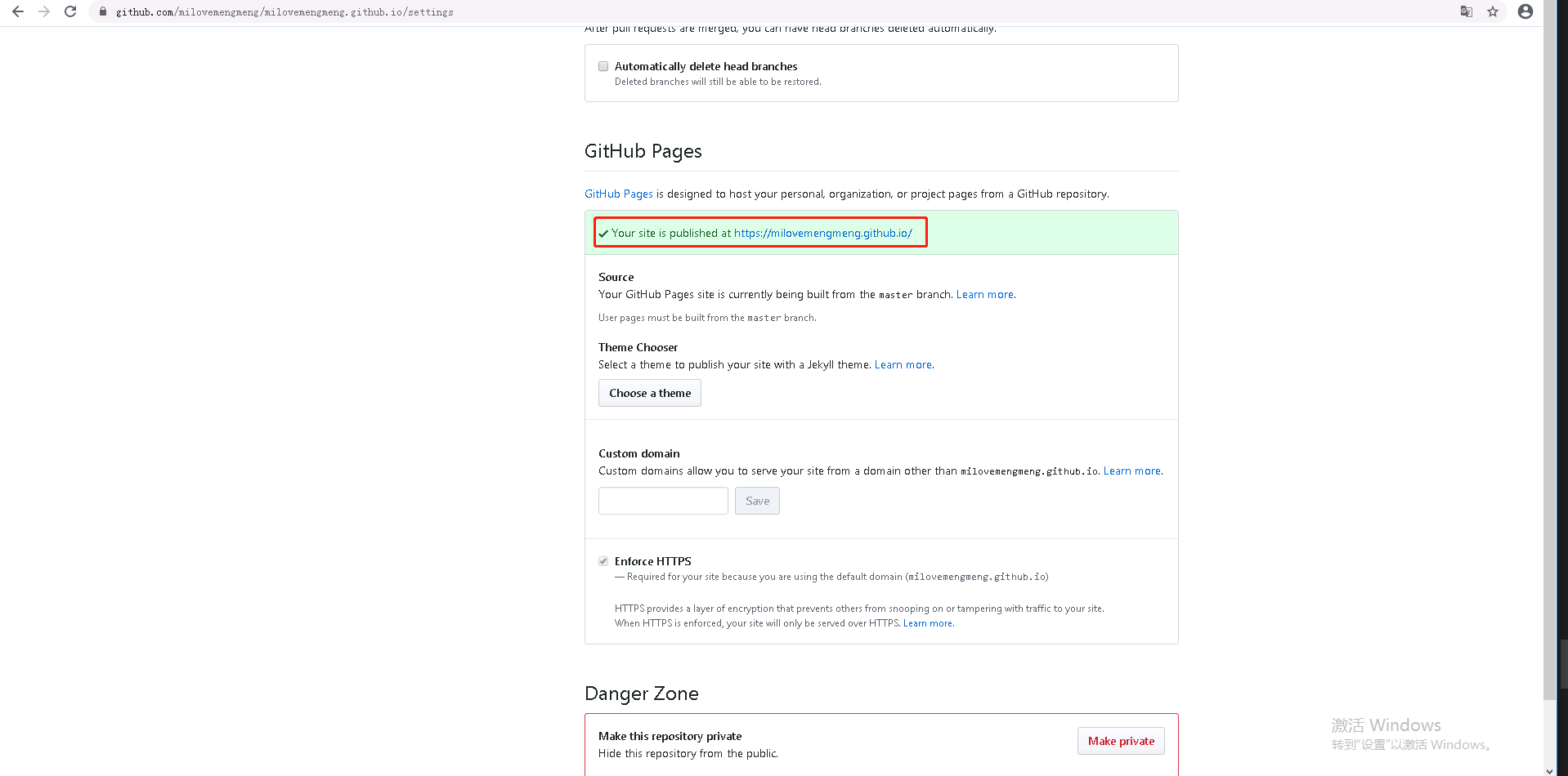点击Settings,进入GitHub Pages配置,由于之前新建仓库的时候,仓库名为username.github.io,github已经自己为我们发布了静态的页面。如果不是username.github.io的格式,则需要手动配置。